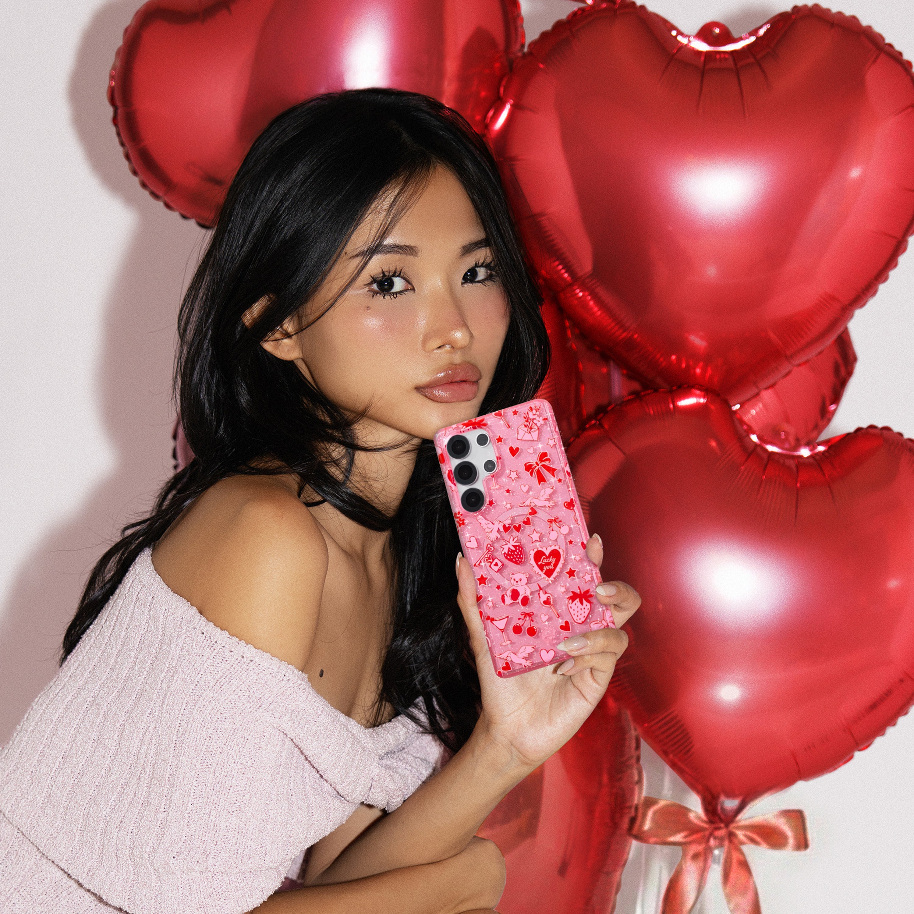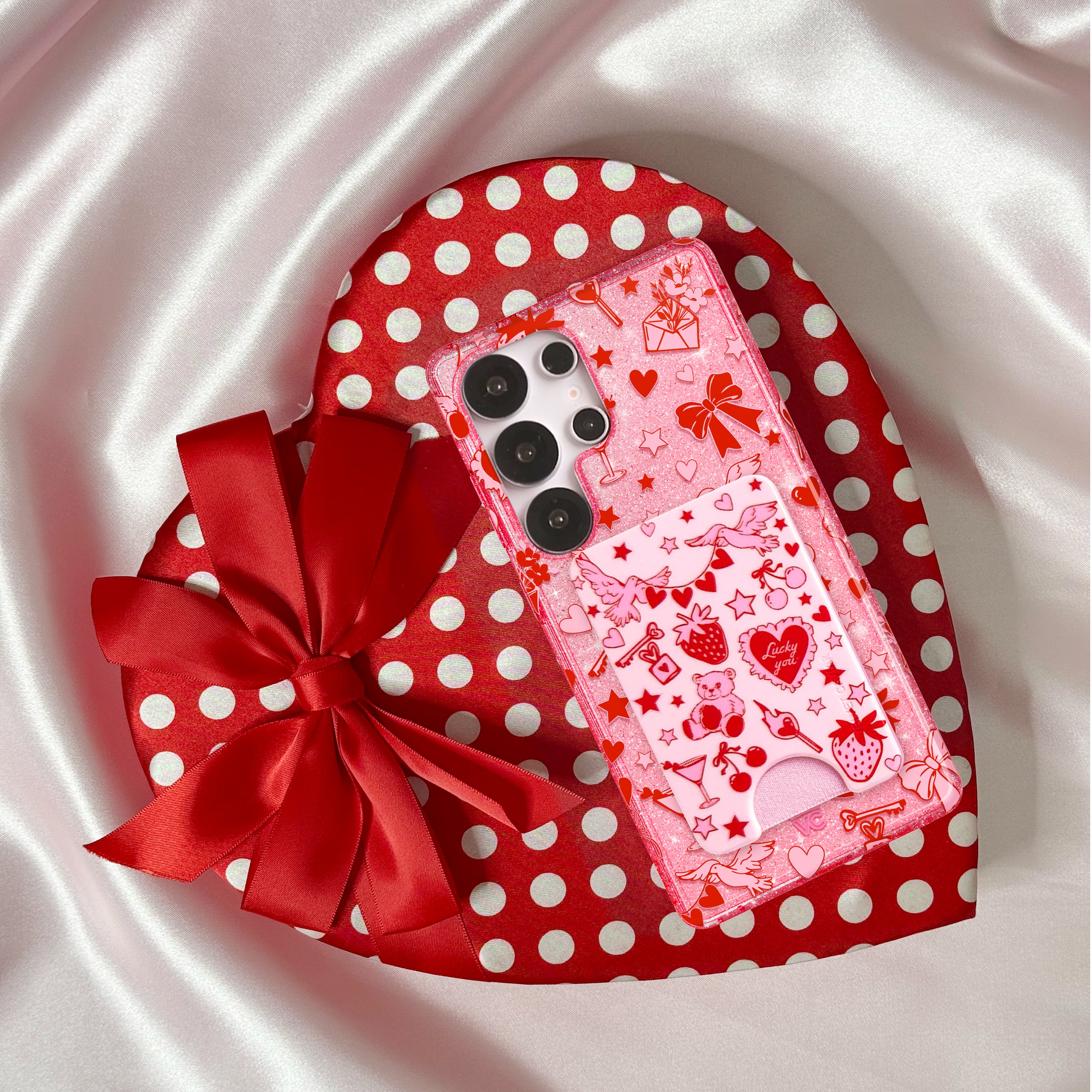 Be Our Valentine! This Limited Edition protective case features a clear pink base with romantic red and pink touches throughout and silver glitter sprinkled into the base and bumper.