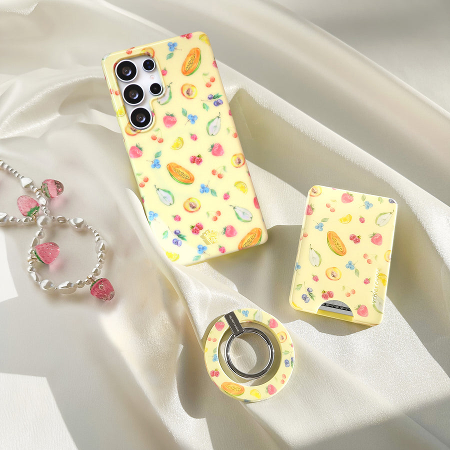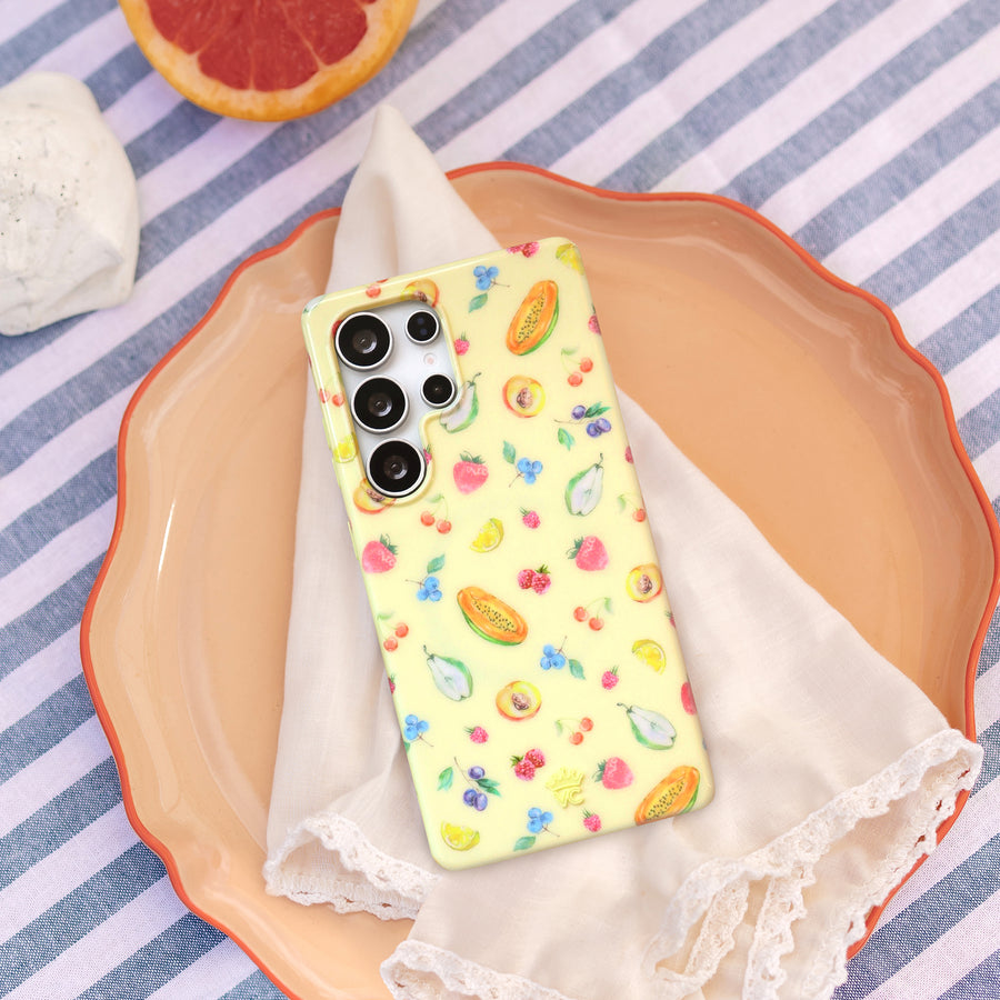 Sweet enough to eat! This protective case features sweet papayas, pears, cherries, lemons, berries and more all on a dreamy butter yellow base.