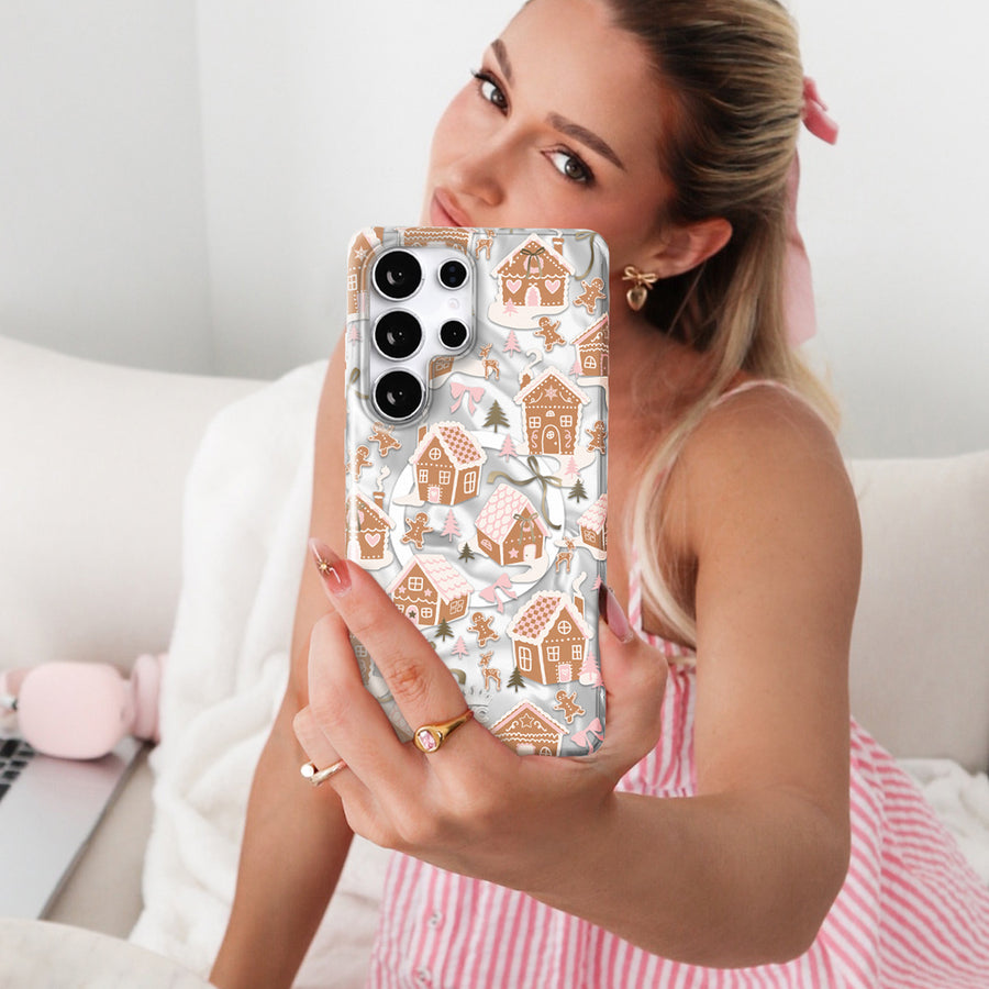 Happy Holidays! This protective case features a gingerbread city on top of a frosting-inspired pearl holographic base. This case is part of our Limited Edition Holiday Dreams collection celebrating Christmas and Hanukkah.