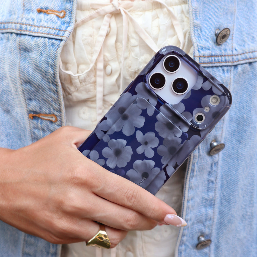 Meet me at midnight! This MagSafe case features 90s inspired grey-tone florals on a translucent navy case.
