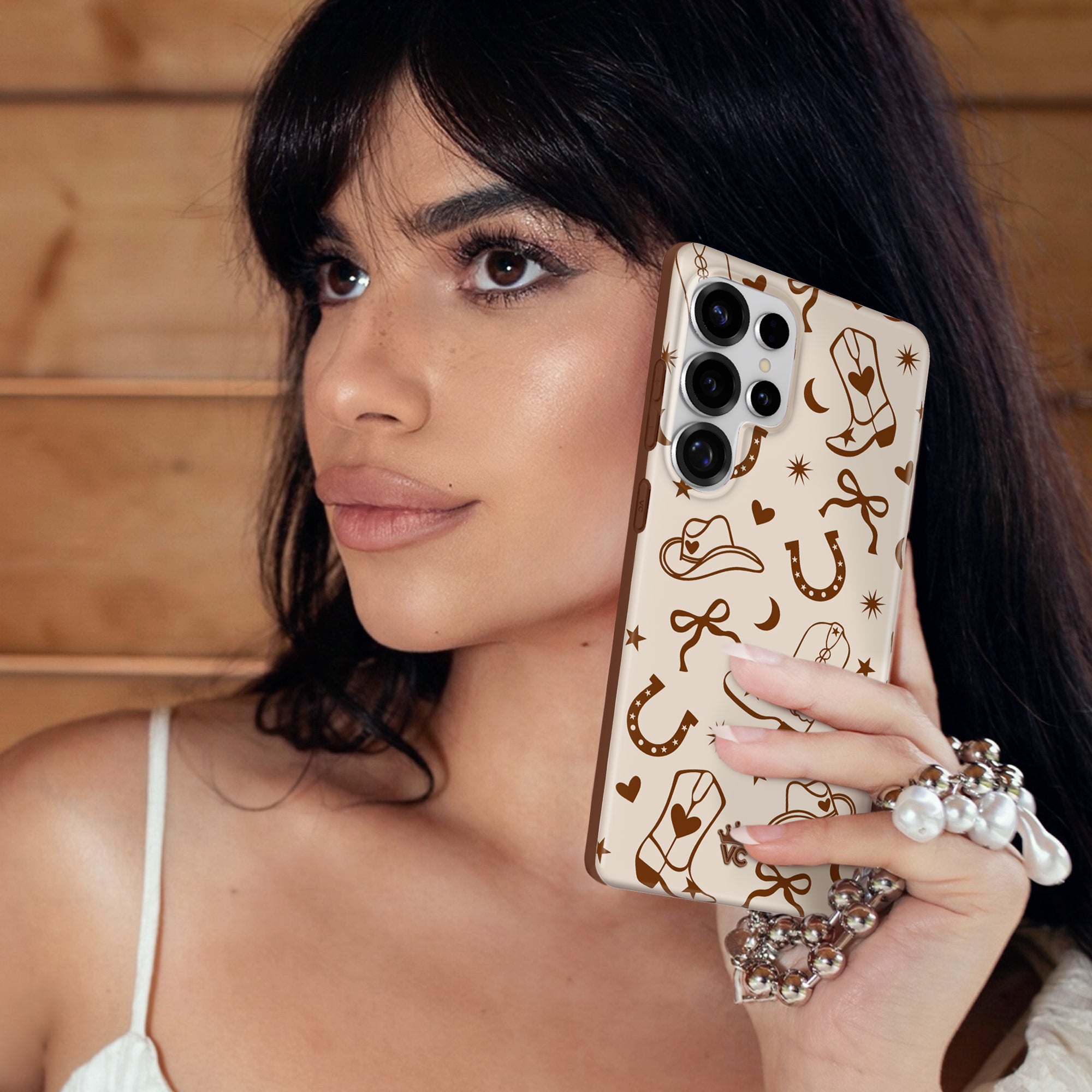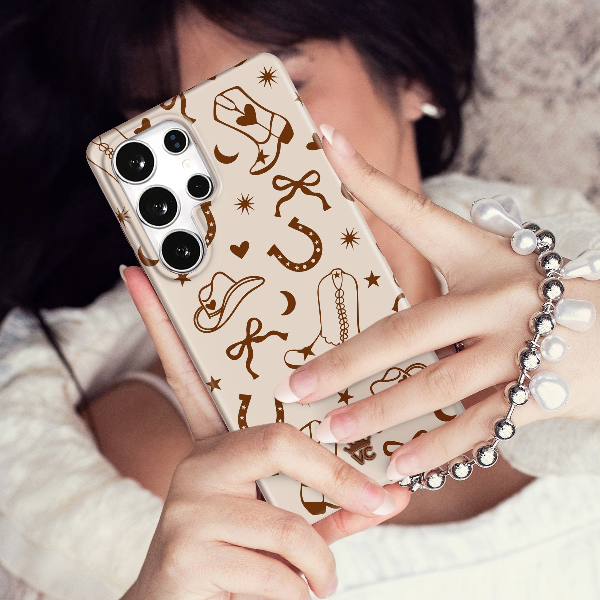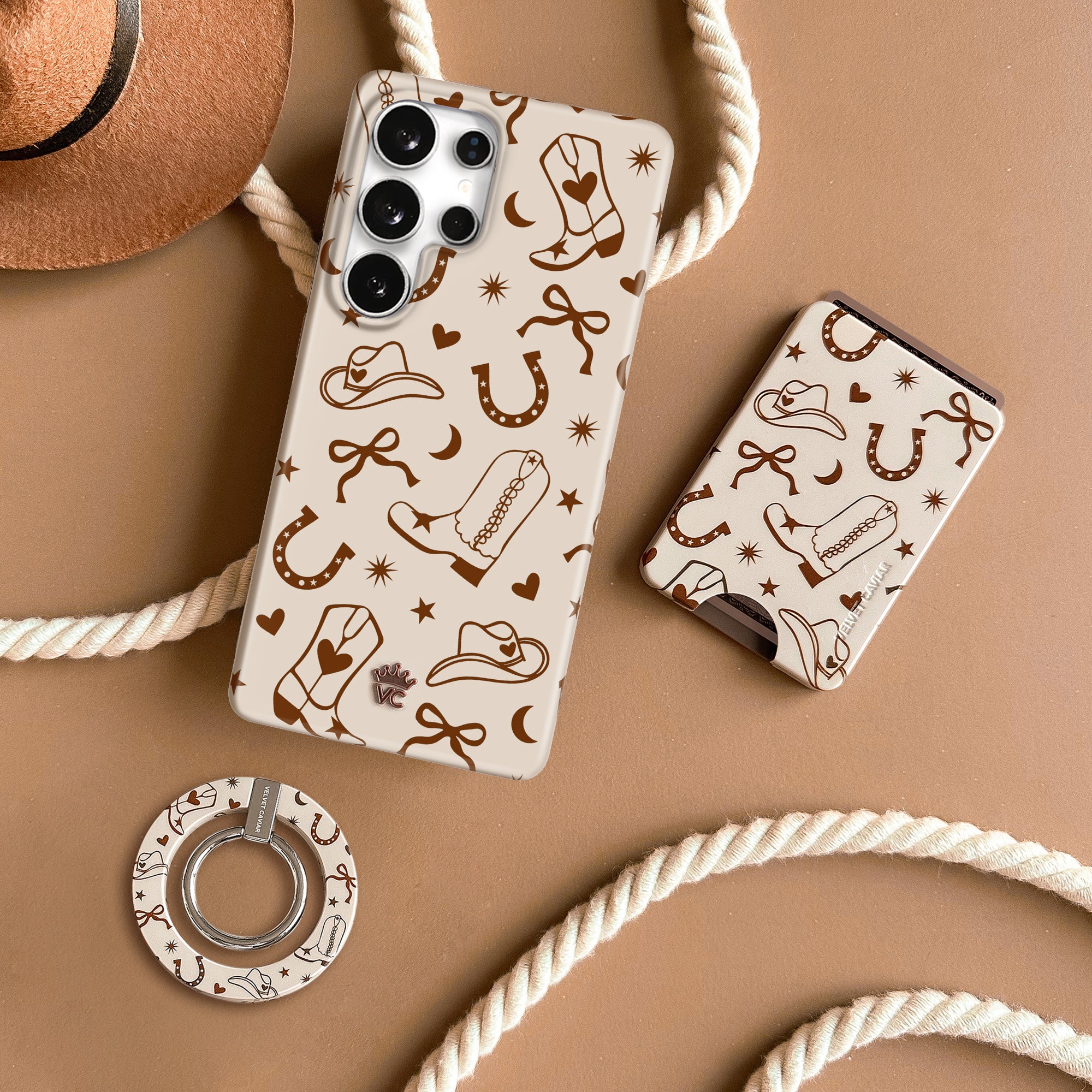 Giddy Up! This western-inspired case features dark brown cowboy boots, bows, cowboy hats, lucky horseshoes and more all on a glossy tan base with a contrasting dark brown bumper.