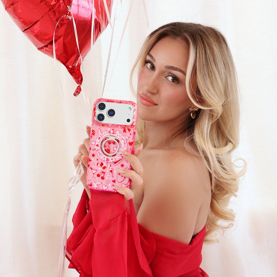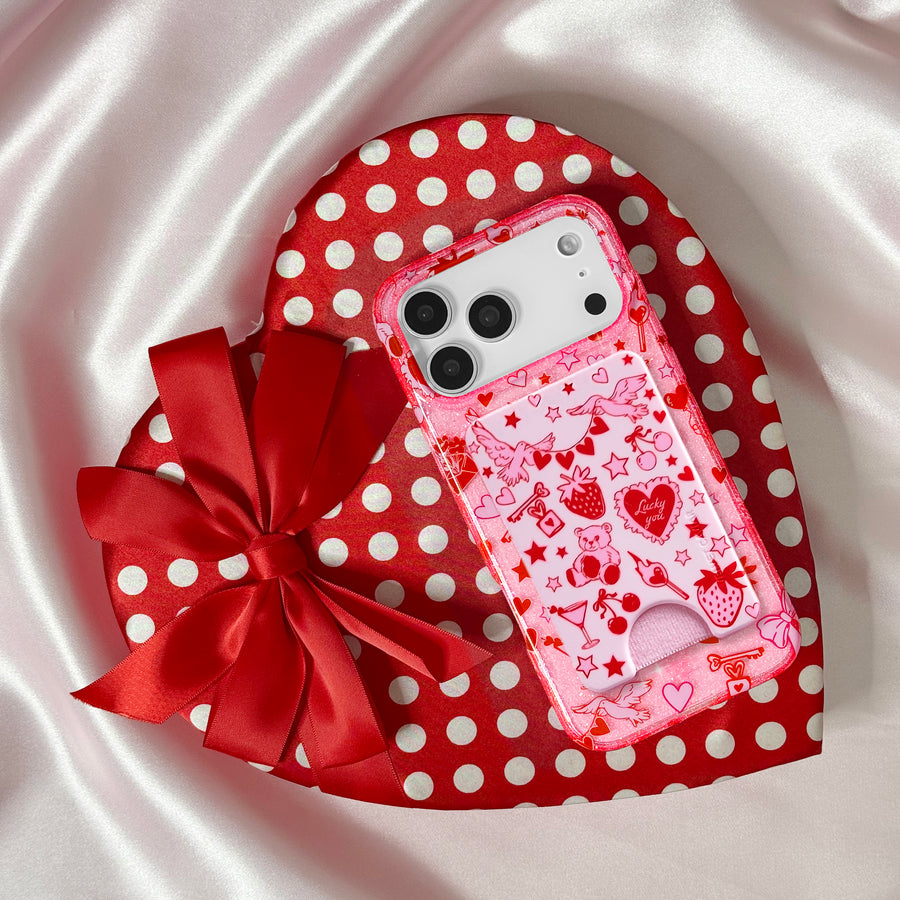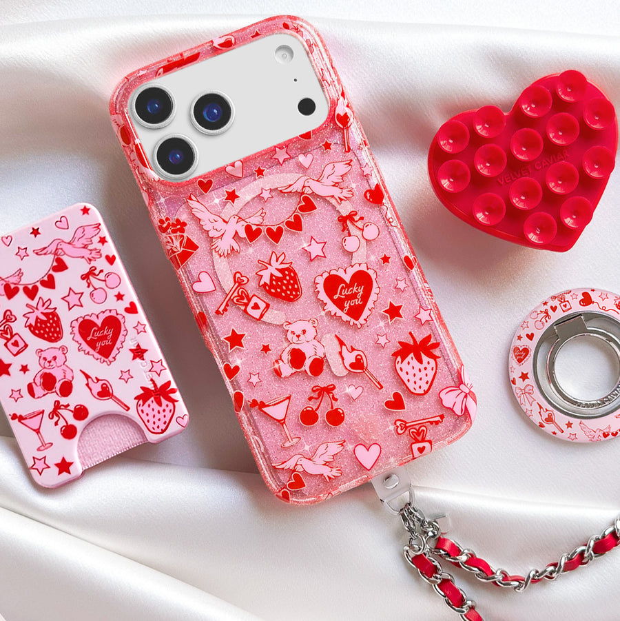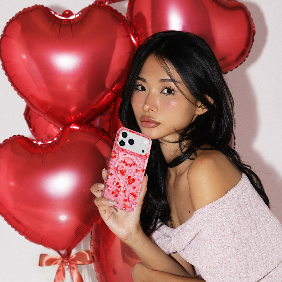 Be Our Valentine! This Limited Edition MagSafe case features a clear pink base withromantic red and pink touches throughout and silver glitter sprinkled into the base and bumper.