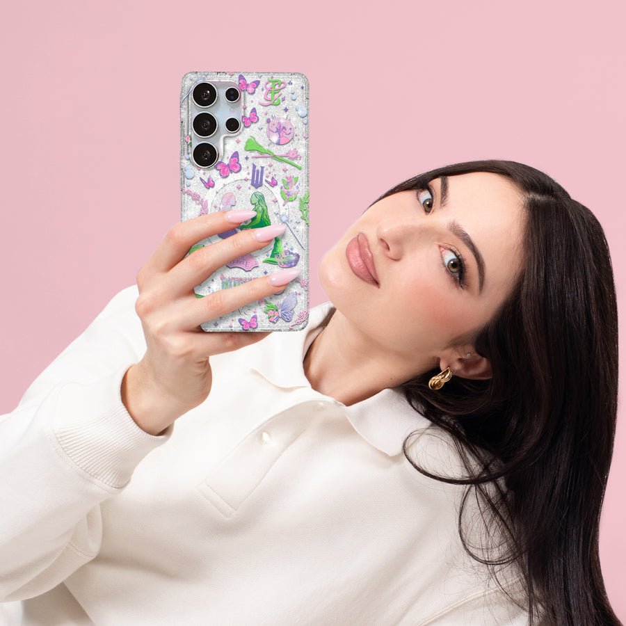 WICKED x Velvet Caviar! This glittering protective case features Elphaba and Glinda front and center with iconic WICKED references in tonal shades of pink, green, purple, and blue throughout.