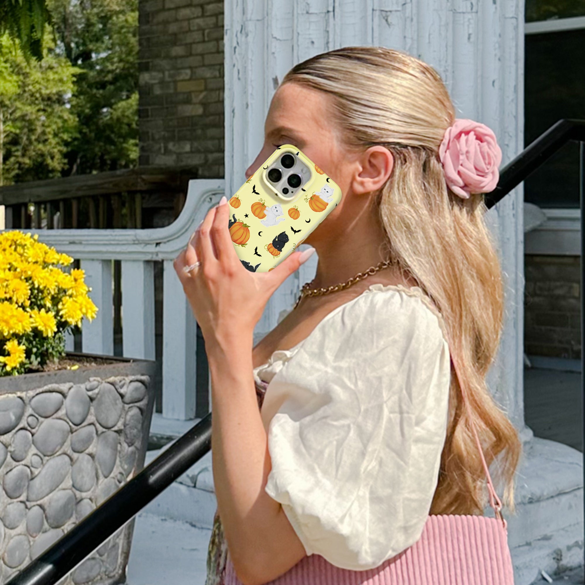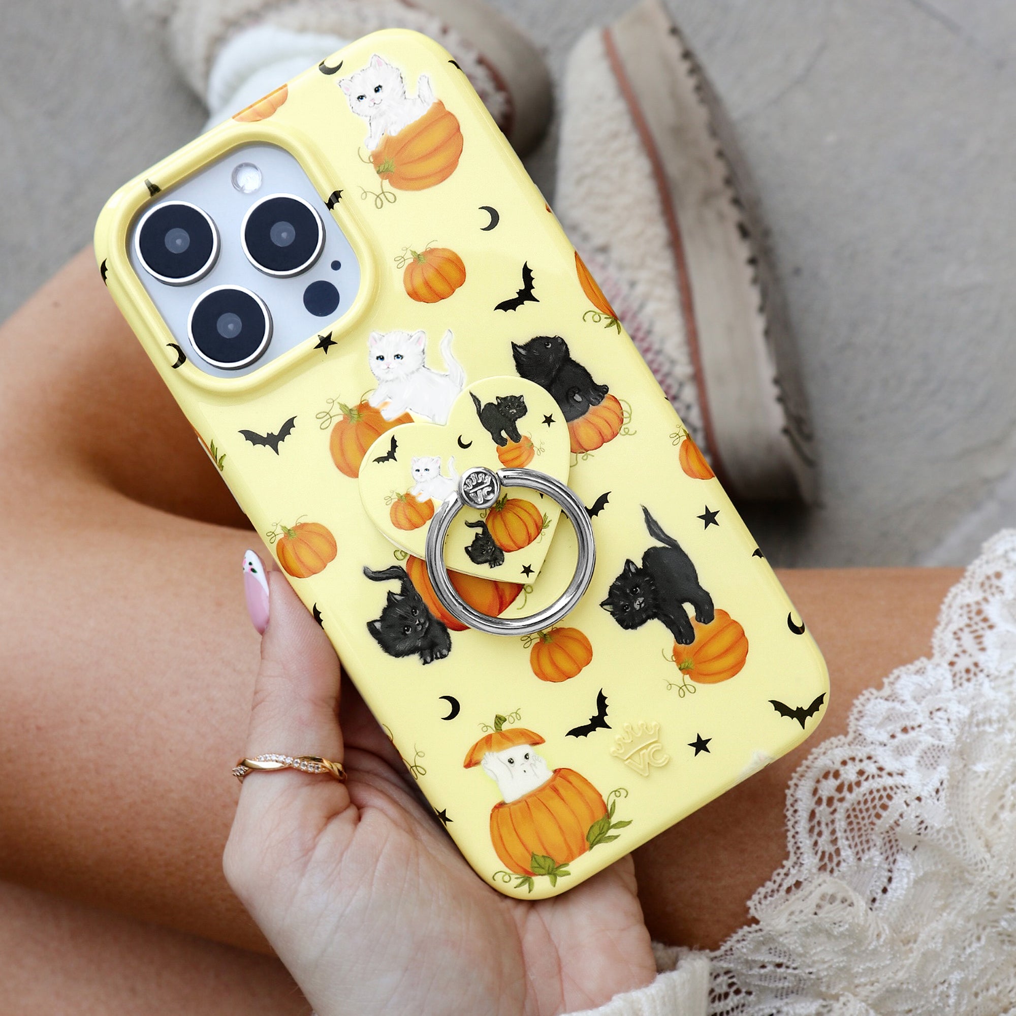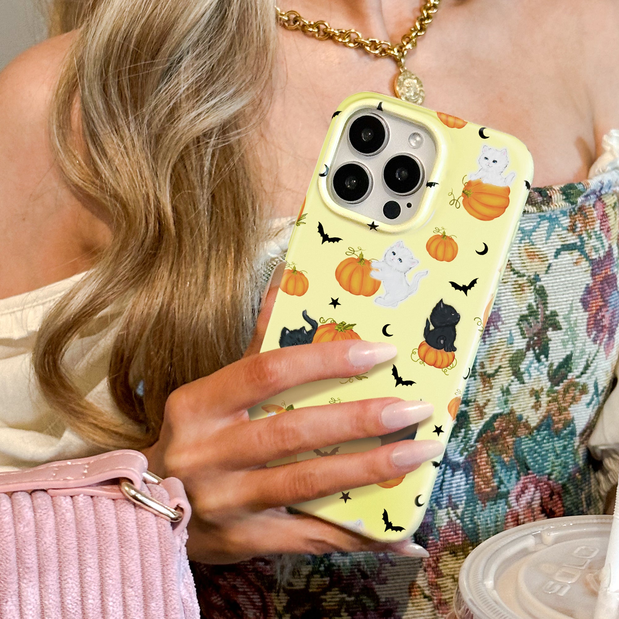 Happy Halloween! This Limited Edition MagSafe case features an array of adorable kittens and perfect fall pumpkins all on a glossy butter yellow base.